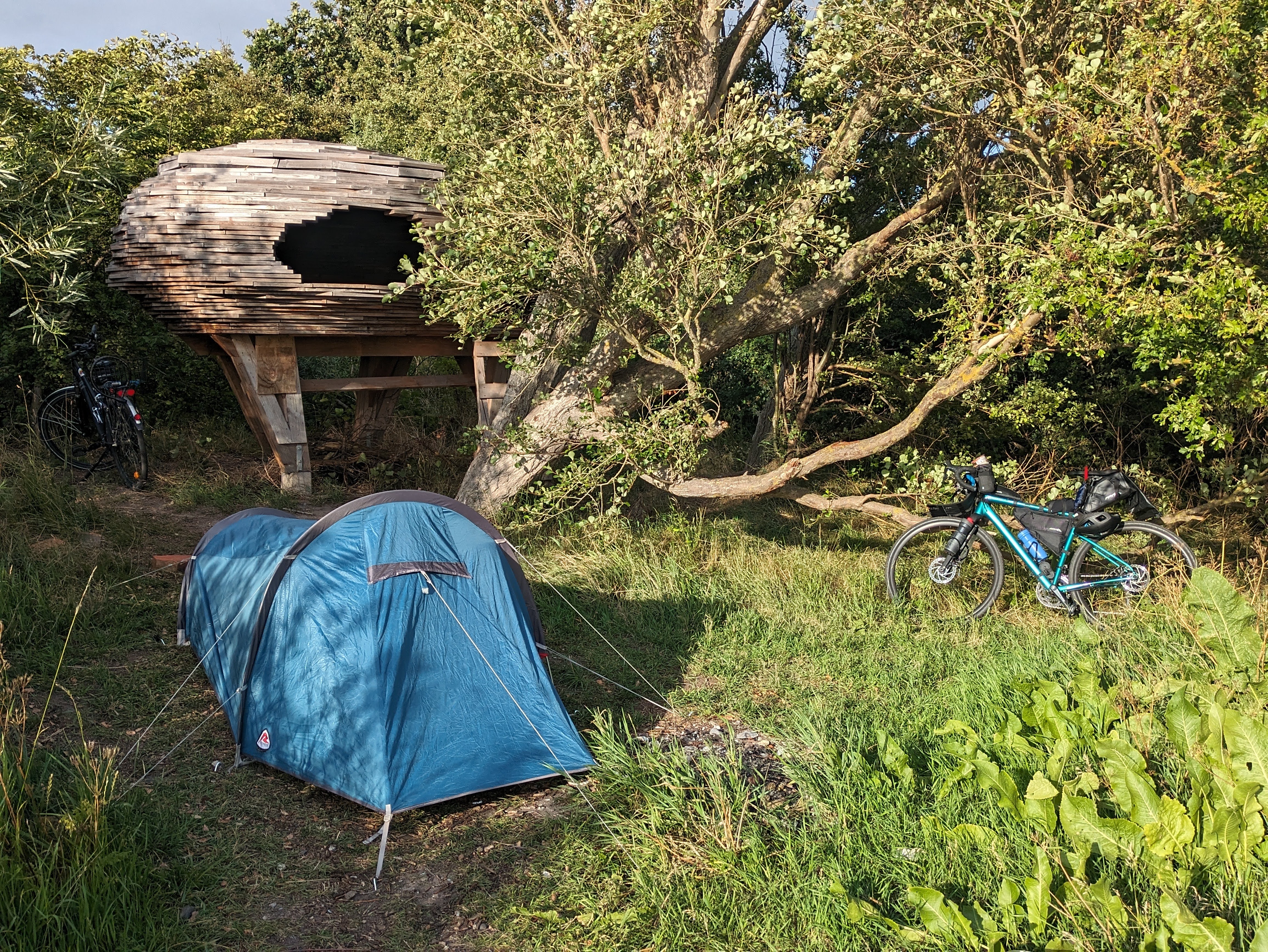 I rode almost 80KMs and decided to call it a day. I was near an amazingly beautiful port of Barsebackhamm. In Sweden (and many other European countries), there is a concept of shelters for hikers. If you need a place to stay dry during a rain, or to crash the night, shelters are perfect. I thought that it would be a good place to camp, so I looked for nearby shelters on the shelter app. There are some very interesting shelters in Sweden, built by innovative group of architects. And I saw one from this nearby, so decided to have a closer look.